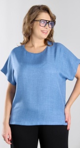 Блуза женская из гладкокрашеного тканого полотна, прямого силуэта, с горловиной овальной формы и цельнокроеными рукавами. Горловина окантована основным материалом, в боковых швах небольшие разрезы.