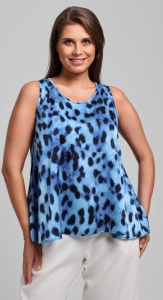 Блузка женская из тканого полотна «искусственный шёлк полиэстер» с набивным рисунком, расклешенного силуэта, без рукавов, с овальным вырезом горловины, окантованным основным материалом.