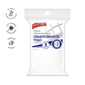 Меламиновая губка You'll love имеет ряд несравненных преимуществ: Губка уже нарезана на кубики, что обеспечивает рациональное использование продукта. Губка сделана из меламина высокой плотности (16 г/м3), что обеспечивает экономичный расход и более эффективное очищение, потому что больше вспененных волокон вбирают в себя больше грязи. Нужно удалить чернила, линии от маркеров, присохшие загрязнения, въевшуюся пыль или очистить подошву обуви? Используйте меламин. Это специальный материал, который бережно и эффективно удаляет даже стойкие загрязнения с поверхностей без использования моющих средств.